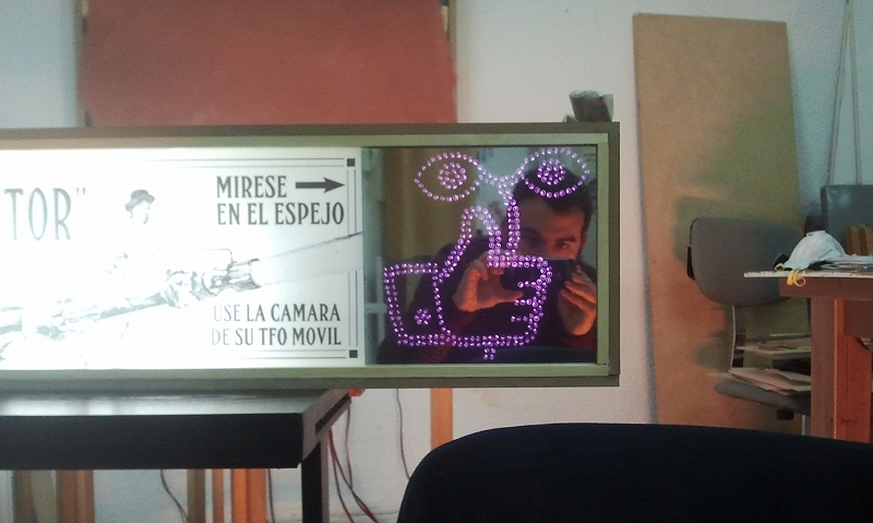 La obra consiste en una caja de luz que replica los rótulos característicos de la publicidad de fin de siglo. La caja termina en un falso espejo, que cuando es observado desde la cámara de un móvil o tablet muestra un icono de otra forma invisible a los ojos. El icono oculto, apreciable sólo a través de cámaras digitales, es una reelaboración del cuadro de Santa Lucía de Francesco del Cossa, en el que ella sostiene con su mano una planta con dos ojos en los extremos. En el espejo mirado desde el móvil, la mano de Facebook aparece con el mismo gesto, sosteniendo dos ojos.
